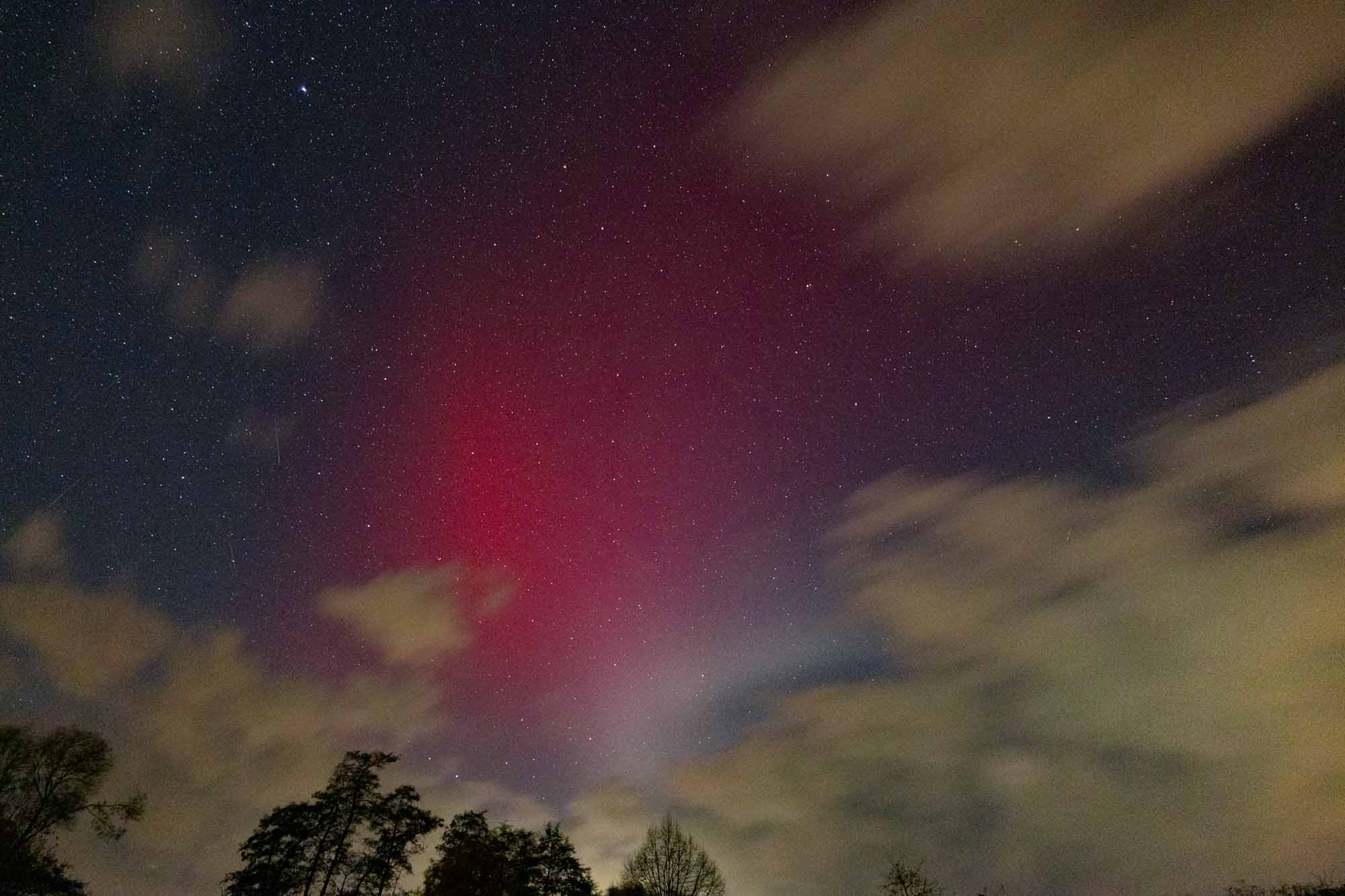 Habe mir nochmals die Bilder angeschaut, ich konnte das ganze in etwa um 20 Uhr (19 Uhr UTC) festhalten. Danach zogen wohl Wolken durch (keine Bilder) und anschließend war ich eher auf das Polarlicht im Norden fokussiert. Danach (gegen 21 Uhr) hatte ich zwar auch Fotos nach Westen, die gingen aber nicht weit genug herunter, waren also eher hoch zum Zenit zum SAR-Bogen. Ein paar Bilder wollte ich aber dennoch zeigen: