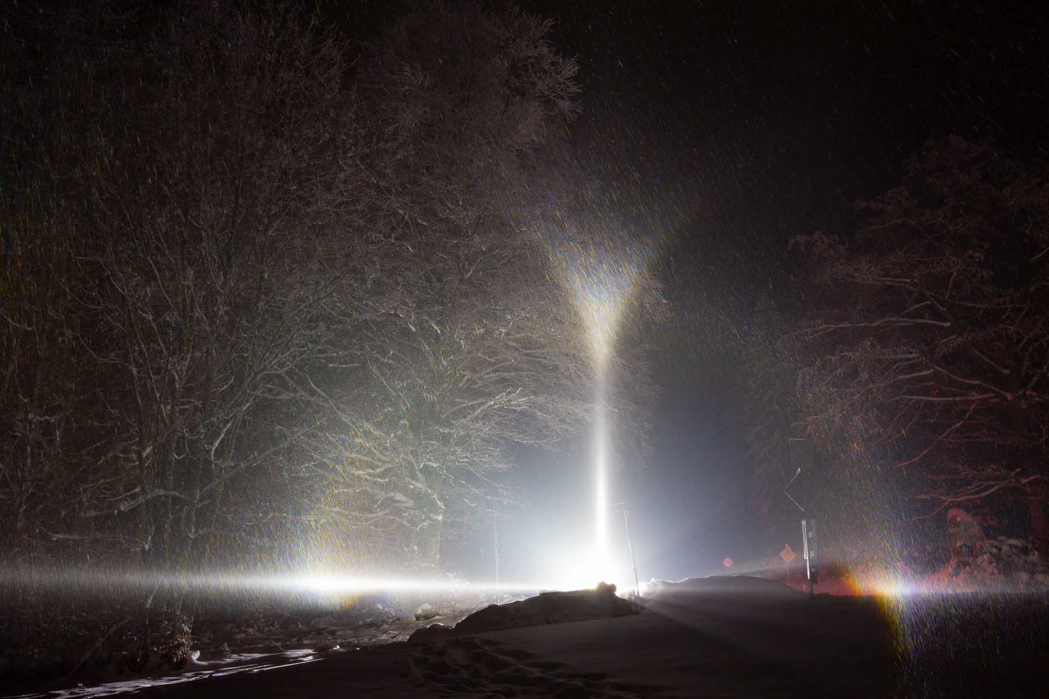 Prompt noch nicht weit sind mir kurz vor dem Waldrasthaus Karches an den Autos schon die riesigen Lichtsäulen an den sich nährenden Autos entgegengekommen. Kurz dort am Parkplatz angehalten die Lichtsäulen an den Lampen und Laternen fotografiert. Ich konnte es wieder nicht lassen noch ein bisschen mit dem Fernlicht am Auto zu spielen.