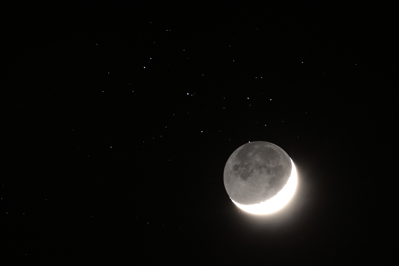 Hier zwei Bilder von dem Abend. Zuerst vom frühen Abend, als noch ordentlich Platz zwischen Mond und Plejaden war: