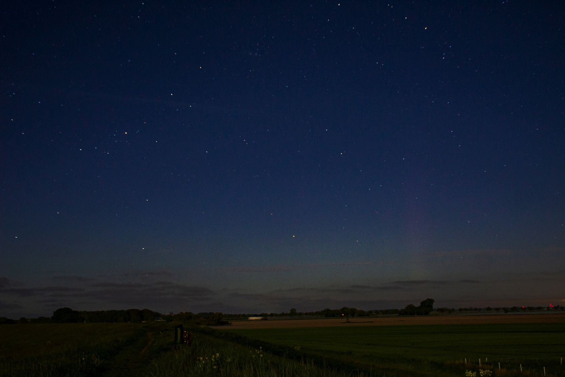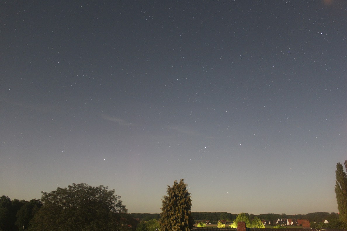 das Polarlicht in dieser Nacht war doch recht kurz nur nachweisbar und kam dann, als man schon dachte, dass jetzt alles vorbei wäre. Das erste Mal etwas nachweisen konnte ich gegen 02:18 MESZ: Kurz danach waren auch einzelne Strahlen erkennbar: Wenig später ließ es dann auch schon wieder nach, einen Strahl gab es dann aber doch noch: