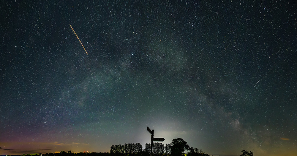 Ein kleines Panorama mit der Milchstraße gibt es auch noch, wo man auch teils bandartigen Airglow sieht: