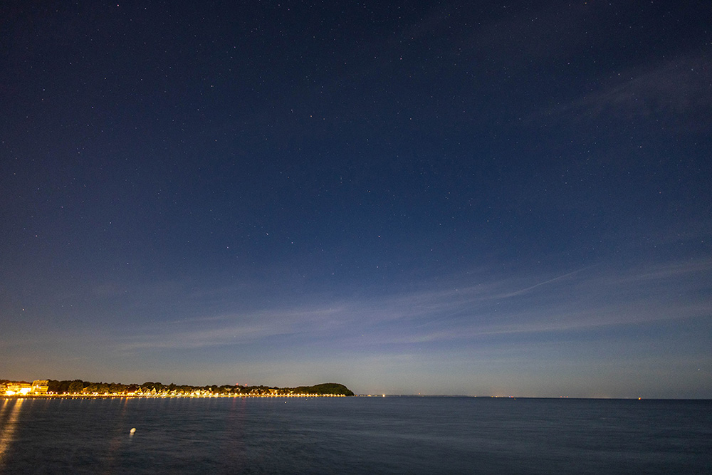 Beobachtungszeitraum: 00:14 bis 00:20 UTC Beobachtungsort: Travemünde (54,0°N) Helligkeit Polarlicht: fotografisch Kommentar: sehr kurzes Polarlicht als rot-violettes Aufglühen. Gestört durch Mond und Cirren