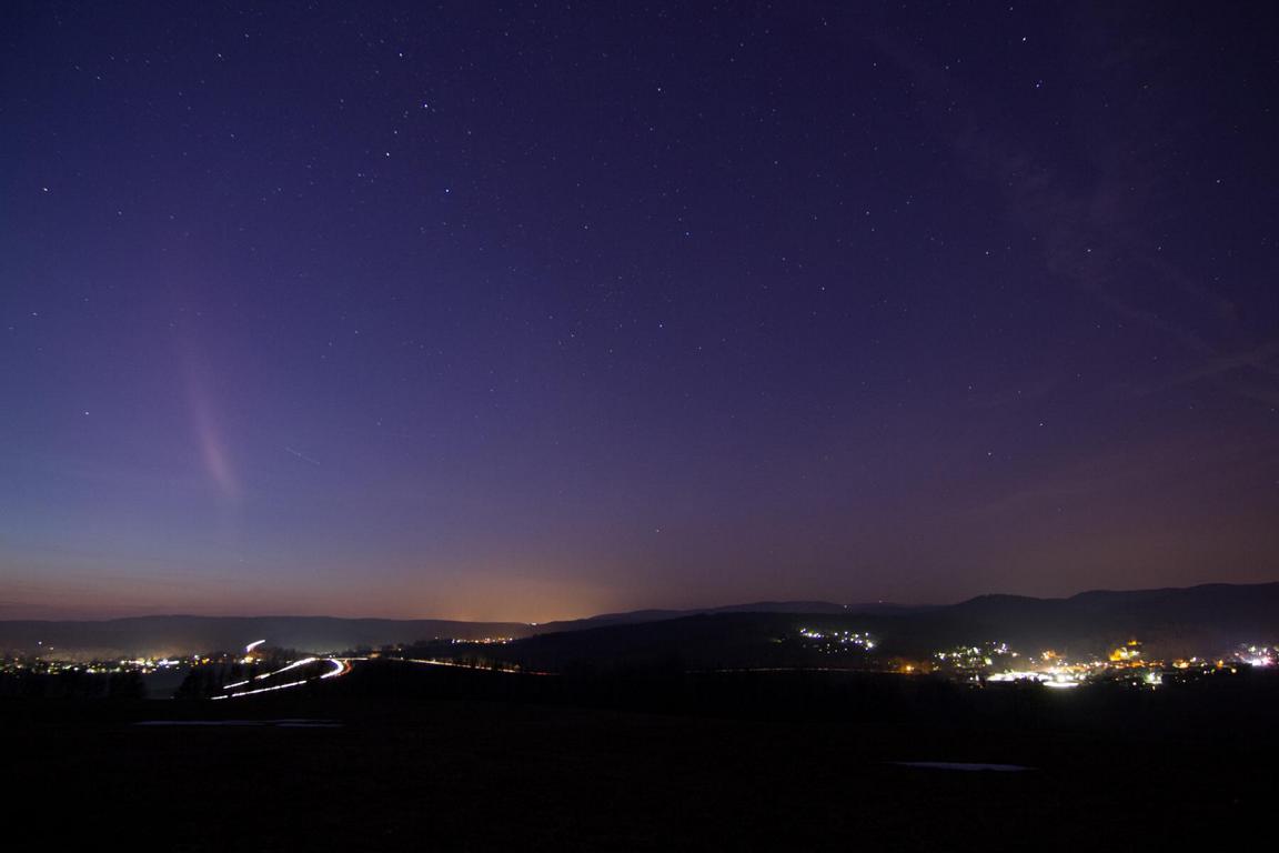 Visuell farbloser Beamer ist in Schleusingen 50.2° um 19:50 MEZ von NNW bis fast in die Venus gewandert. Bis zu 40° hoch. Ich hielt es für einen Contrail, allerdings wurde er breiter und dann wieder schmaler in ca. 1 minute. Violettes glimmen ist immer noch auf den Fotos.