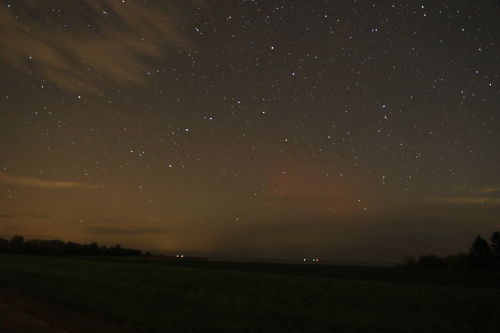 Am 31.10.2021 um 01:32 Uhr konnte ich bei Greifswald Richtung Nord-Nordost über dem Greifswalder Bodden und leicht rechts unterhalb des Großen Wagen ganz leichte rötliche PL ausmachen.