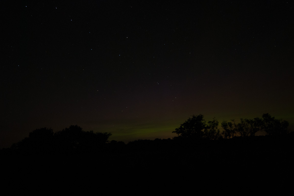 Zwar nur fotografisch, und die visuel wahrnehmbare Aufhellung könnte auch nur auf Streulicht an Dunst oder tiefen Wolkenresten zurück zu führen sein, fotografisch waren aber grünlich und lila Farben ähnlich wie auf den Bildern aus Norddeutschland zu erahnen. Da könnte diese Nacht noch mehr kommen, doch leider muss ich morgen früh schon wieder raus zum Arbeiten...