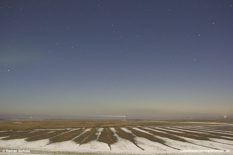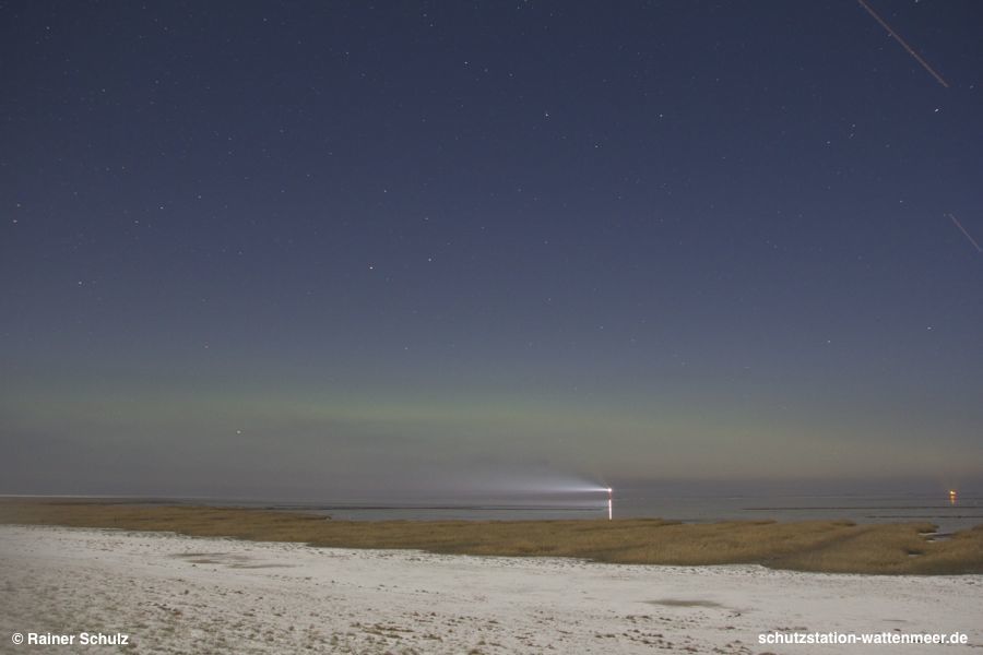 vielen Dank für die Meldung! In St. Peter-Ording kam ich kurz nach 19 Uhr nach draußen. Auf dem Weg mit dem Fahrrad zum Deich an die Tümlauer Bucht waren bis auf Höhe der Deichsel des Großen Wagens immer wieder helle Flecken zu sehen, die ich aber für vom Mondlicht erleuchtete Wolkenschleier hielt. Sonst hätte ich sofort in Nähe des Ortes schon das Stativ aufgebaut. Am Deich stellte sich dann bei den beiden ersten Fotos heraus, dass diese im Bild grünlichen Schimmer zum "oberen Bogen" des Polarlichts gehörten. Leider waren es in der Höhe die letzten. Danach war der untere Bogen in unterschiedlicher Stärke noch bis nach 22 Uhr zu sehen. Später war nicht mehr klar, was Polar- und was Mondlicht war.