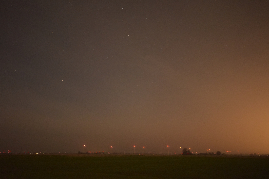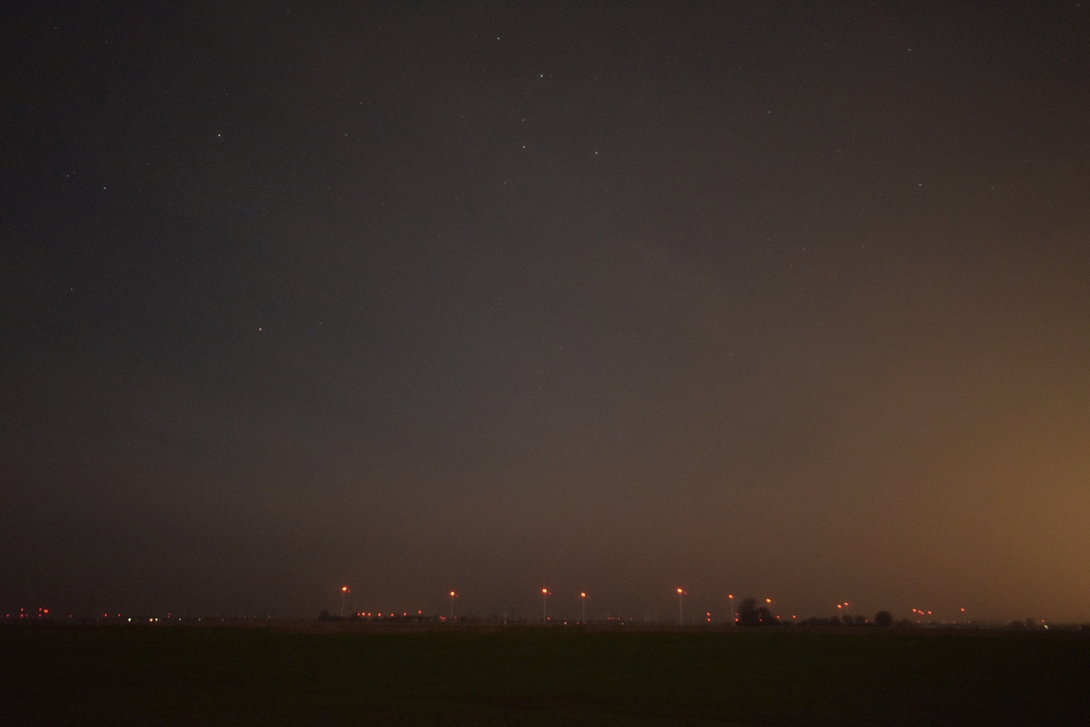 Im Hintergrund sind Windkraftanlagen zu sehen. Der störende seitliche Lichtsmog stammt von der Raffinerie.