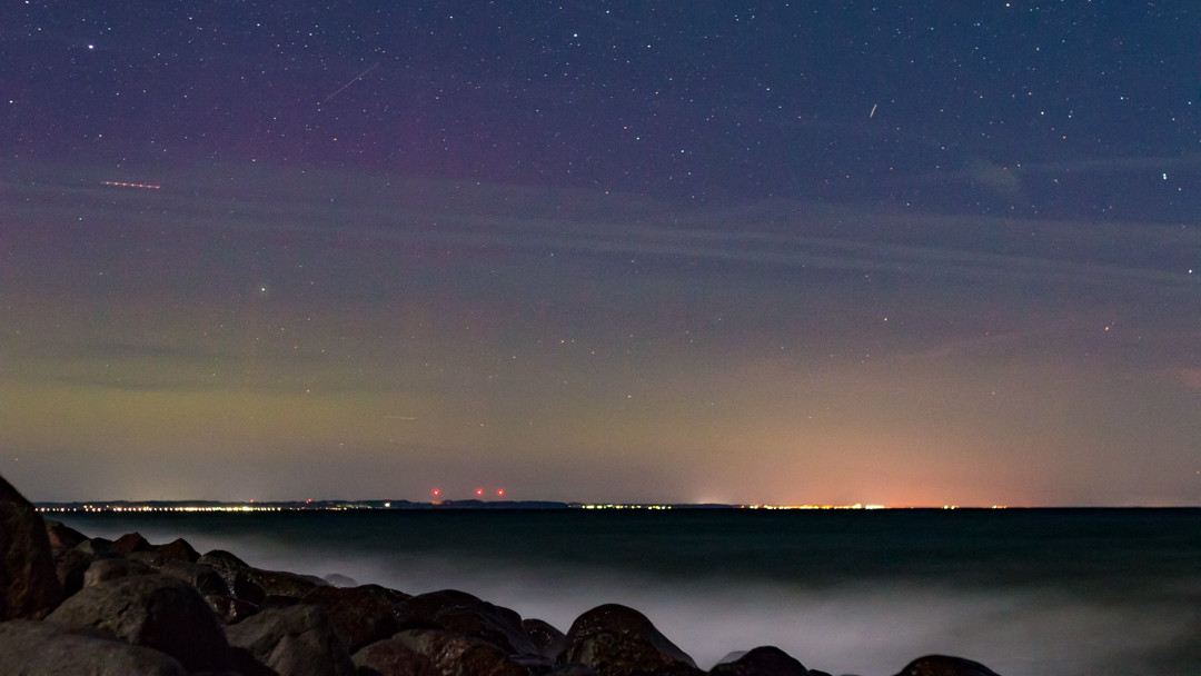 zur Vervollständigung ein Bild (21:30 MEZ) aus Tröndel, 54.3°O; 10,5N Blick Richtung Dänemark. Fotographisch diffuses Grün, sowie etwas Mangenta. So in etwa wie bei Thomas....