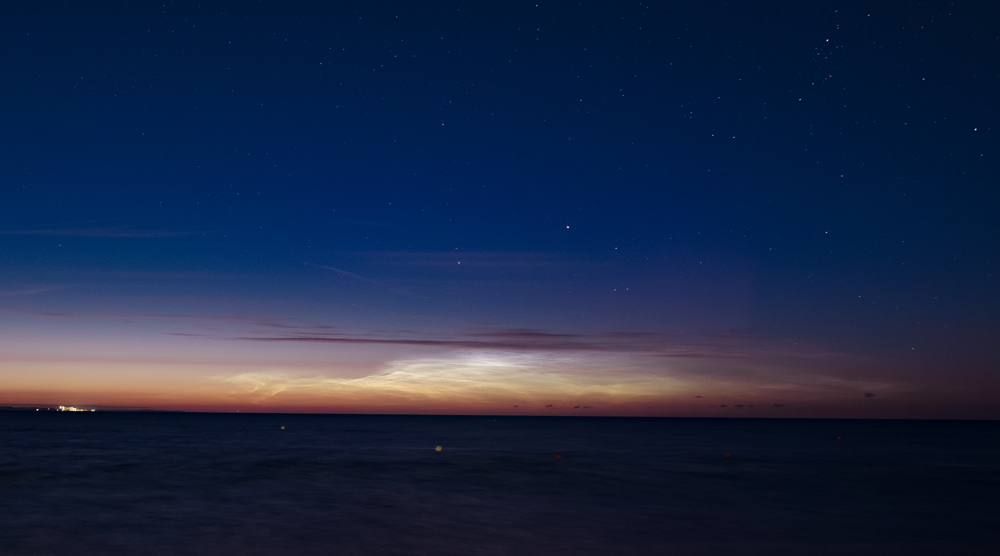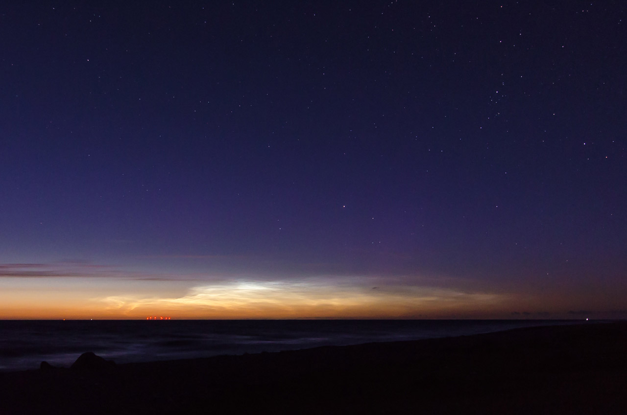 Ich war mit Jonas und noch zwei anderen befreundeten Fotografen am Strand in Westermarkelsdorf (Fehmarn) und wir haben nur wehmütig auf die Sonnenwinddaten geschaut und derweil die ansehnlichen NLCs genossen. Als ich später meine Bilder durchgeschaut habe, traf mich fast der Schlag. Dank der Benutzung eines kontrast-und sättigungsarmen Flat-Profils zunächst kaum auf den Bildern erkennbar, entdeckte ich die wandernden Strahlen erst beim Durchscrollen auf dem PC.