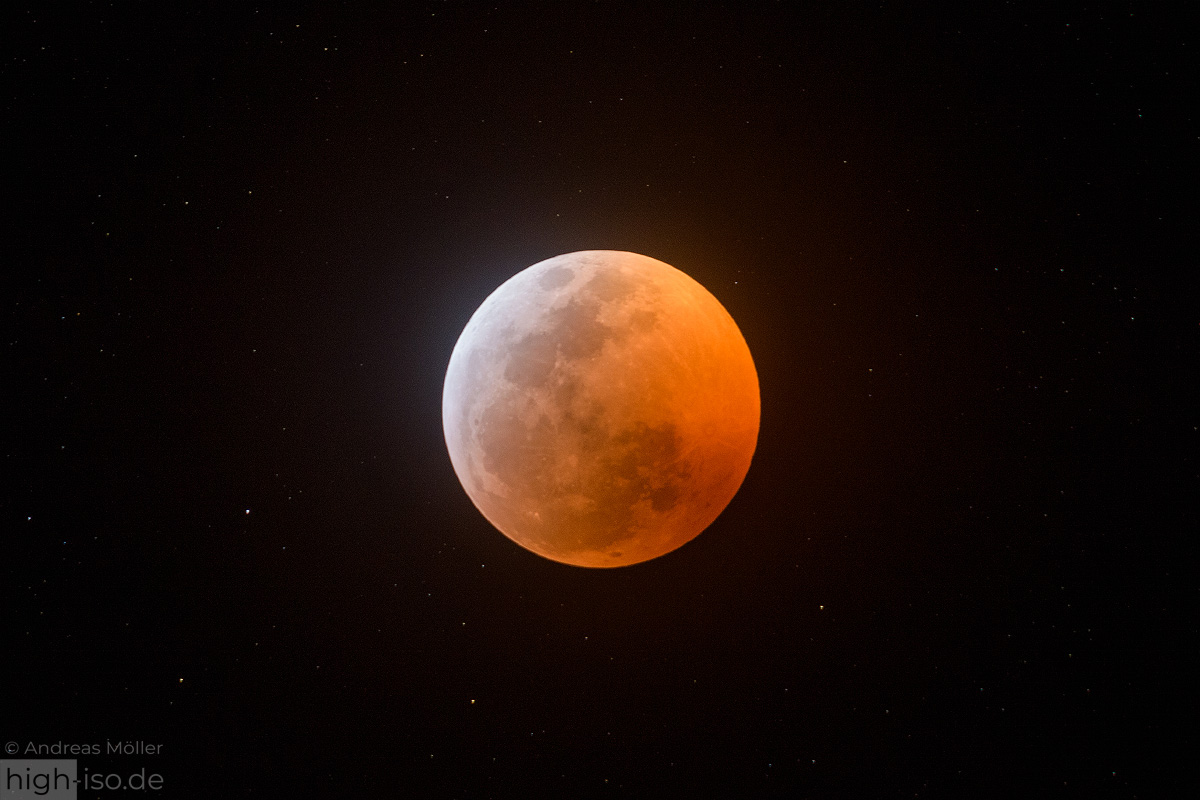 vorigen im letzten Juli. Die jetzige Mondfinsternis war allerdings viel besser zu beobachten, weil Hoch Brigida quer über Deutschland lag und alle Wolken in der Region vertrieben hat. Nur die Lichtverschmutzung von den belgischen Autobahnbeleuchtungen konnte einem noch in die Suppe spucken. Die Beobachtung war diesmal allerdings eine Prüfung für Mensch und Ausrüstung, denn an meinem Beobachtungsort bei Kalterherberg war es -13 °C kalt. Für die Fotos ist die Kälte sogar besser, denn durch die natürliche Kühlung arbeitet der Bildsensor etwas rauschärmer.