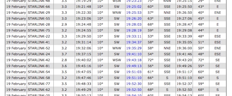 lt. heavens-above ist die "Lichterkette" schon so weit auseinadergezogen, dass dieser Eindruck nicht mehr entsteht (zumindest für die des ersten Wurfes). Hier mal ein Ausschnitt aus heavens-above: Da zudem der Himmel bewölkt war (und ich auch nicht weiter beobachten konnte – ich wollte lediglich einen Kontrollblick auf Betelgeuze werfen!), konnte ich nachfolgende Satelliten nicht auf ihre scheinbare Helligkeit überprüfen (zumal ich zu diesem Zeitpunkt noch nicht ahnte, dass es überhaupt ein Starlink sein könnte!). Interessant wäre sicherlich der folgende Starlink 42 gewesen (2 min später), der lt. heavens-above sogar eine ganze Größenklasse heller prognostiziert war!