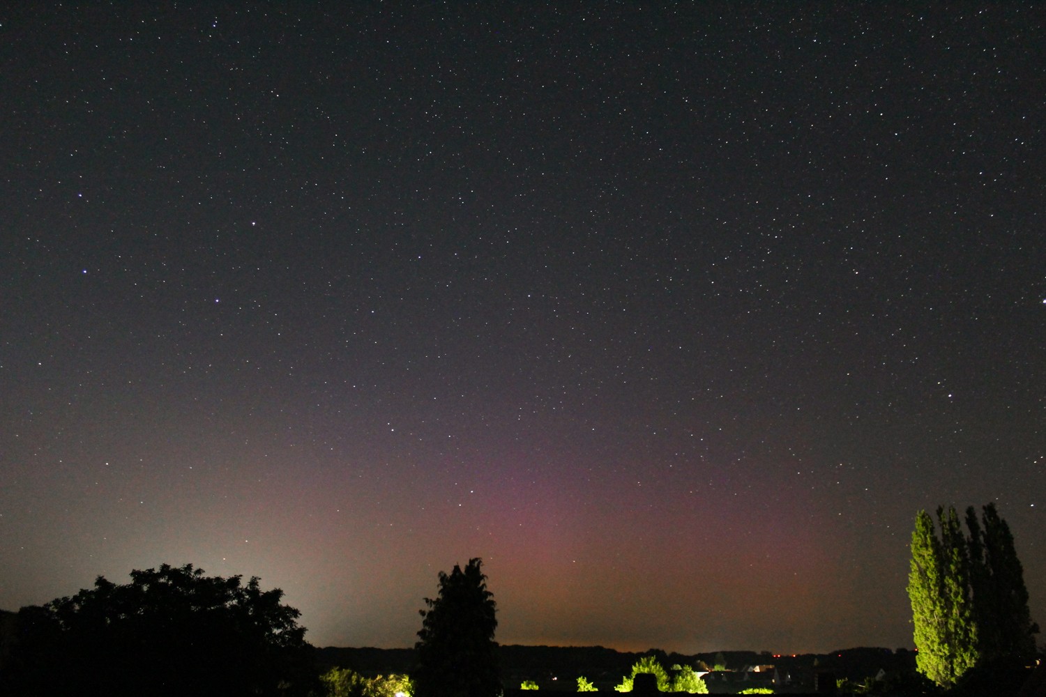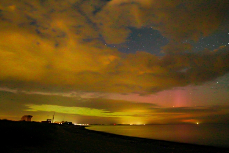 Kommentar: grüner gleichmäßiger Polarlichtbogen (max. Helligkeit: deutlich visuell), rote diffuse Flächen (max. Helligkeit: schwach visuell), blaues Polarlicht (fotografisch); Beamer (max.Helligkeit: deutlich visuell)