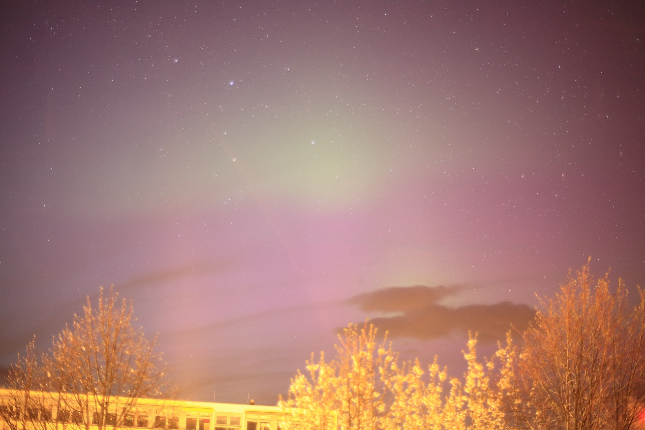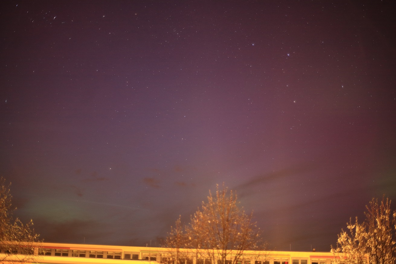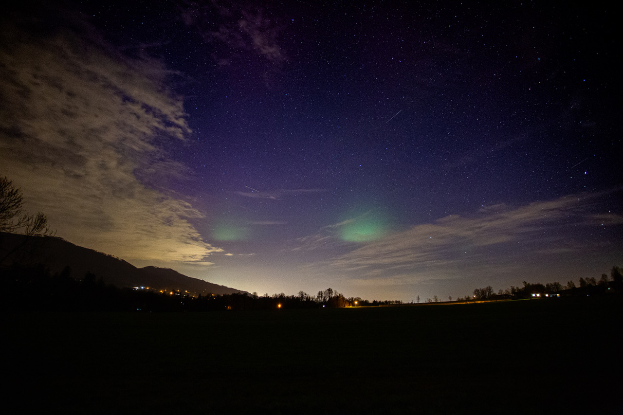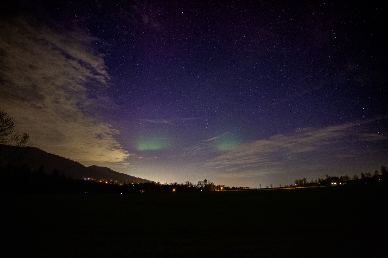 den wunderbaren Bildern und interessanten Berichten zum großen Polarlichtereignis möchte auch ich noch meine Eindrücke des Abends hinzufügen. Die Wetterprognose für den Abend und die Nacht war nicht sehr vielversprechend. Wider Erwarten klarte es bei Einbruch der Dämmerung doch auf, erst um etwa 23 Uhr zog der Himmel beinahe komplett zu, sodass nur mehr in einigen Wolkenlücken das Nordlicht schwach nachweisbar war.