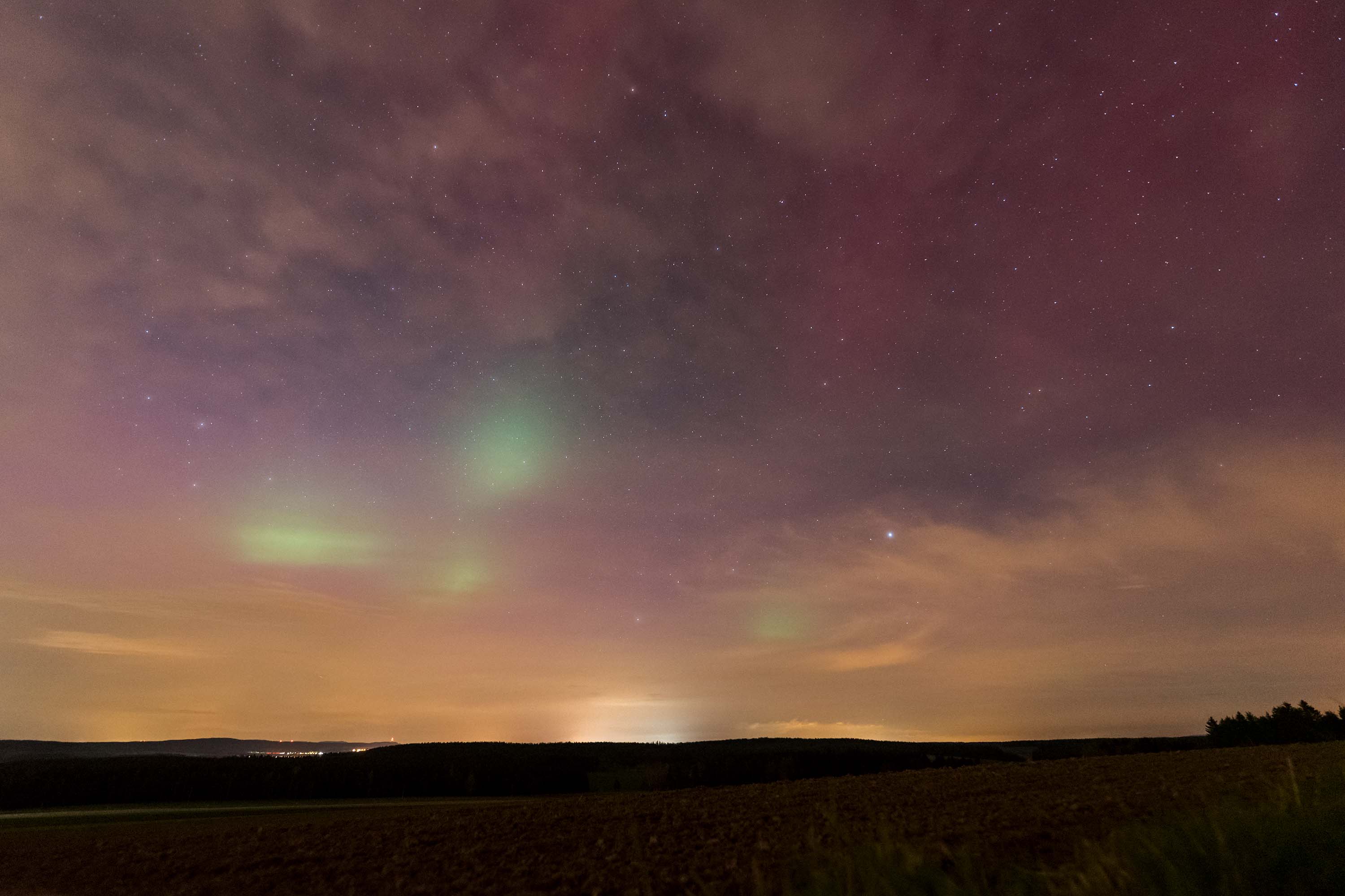 auch im Landkreis Tirschenreuth konnte ich die Polarlichter beobachten. Ich war bereits zur frühen Dämmerung an meinem Aussichtshügel, da die Werte großes versprachen. Die Bilder zeigten im Nachgang, dass das erste fotografische rote Polarlicht bereits um 21:04 MESZ zu fotografieren war. Die Sonne war zu diesem Zeitpunkt an meinem Standort 7°30' unter dem Horizont! Visuell war davon natürlich nichts zu erkennen.