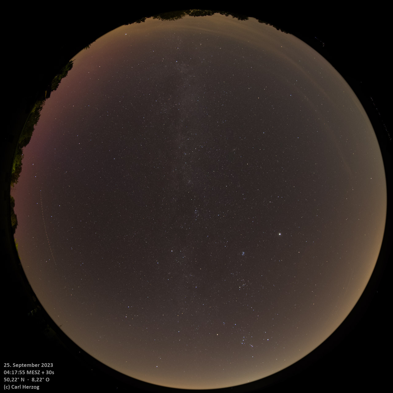 Irgendwie habe ich Dein Aufruf verpaßt. Hier ergänzend meine Aufnahme vom 25.09, Standortdaten in der Bildlegende. Die Nordseite auf Baumkronenhöhe entspricht ungefähr 10° über dem Horizont. Die Spitze scheint bei mir bei ca. 70° über dem Horizont zu liegen.