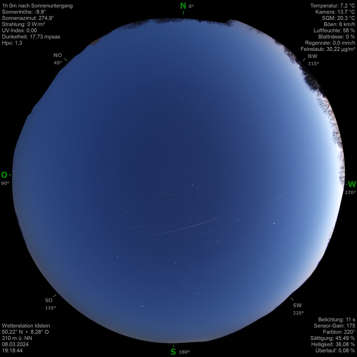 Die Allsky-Aufnahmen zeigen ihn tief im Westen gegen 19:15 und tief im Osten gegen 19:22.