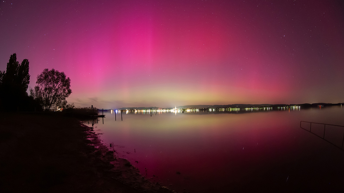 Die Aufnahmen für diese Panoramafoto ( 3x 14mm hochkant) entstanden um 00:16 heute früh. Auserdem war hier am Bodensee eigentlich von Sonnenuntergang bis Sonenaufgang Polarlicht durchgehend min schwach visuell wahrnehmbar. Meist im rosa Farbbereich mit streifen vom Horizont senkrecht. Ausser in diesen paar Minuten