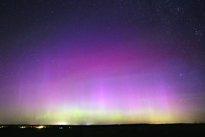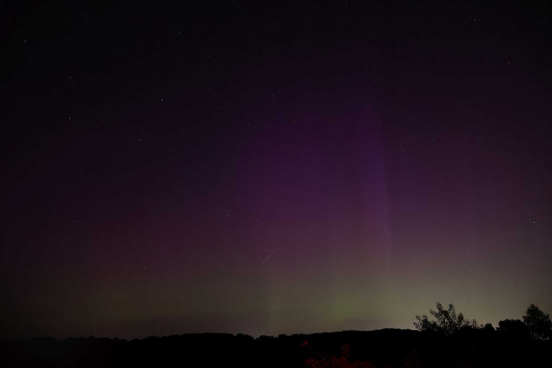 Beschreibung: grünes Band mit rot-violetten Strahlen, teilweise Vorhang. Farben nur zu erahnen, parallel Beobachtung der Perseiden 2024.