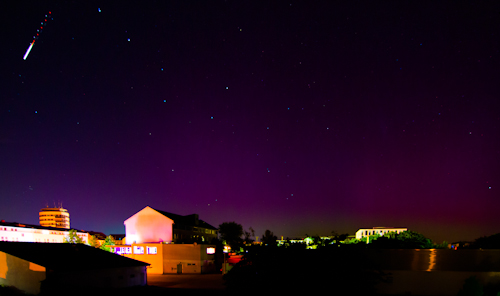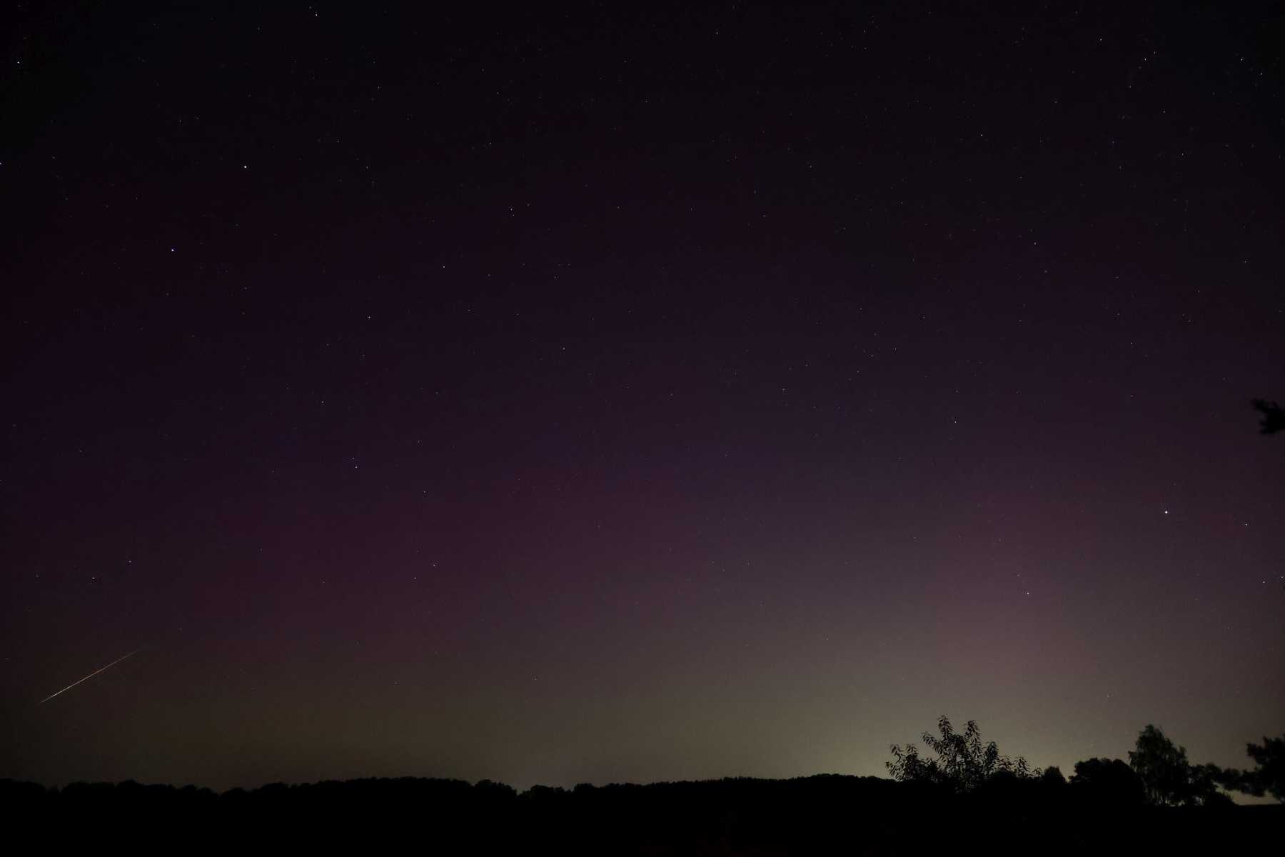 Der erste Nachweis von violettem Polarlichtglühen mit evtl. wenigen Strahlen gelang fotografisch um 22:39 MESZ.