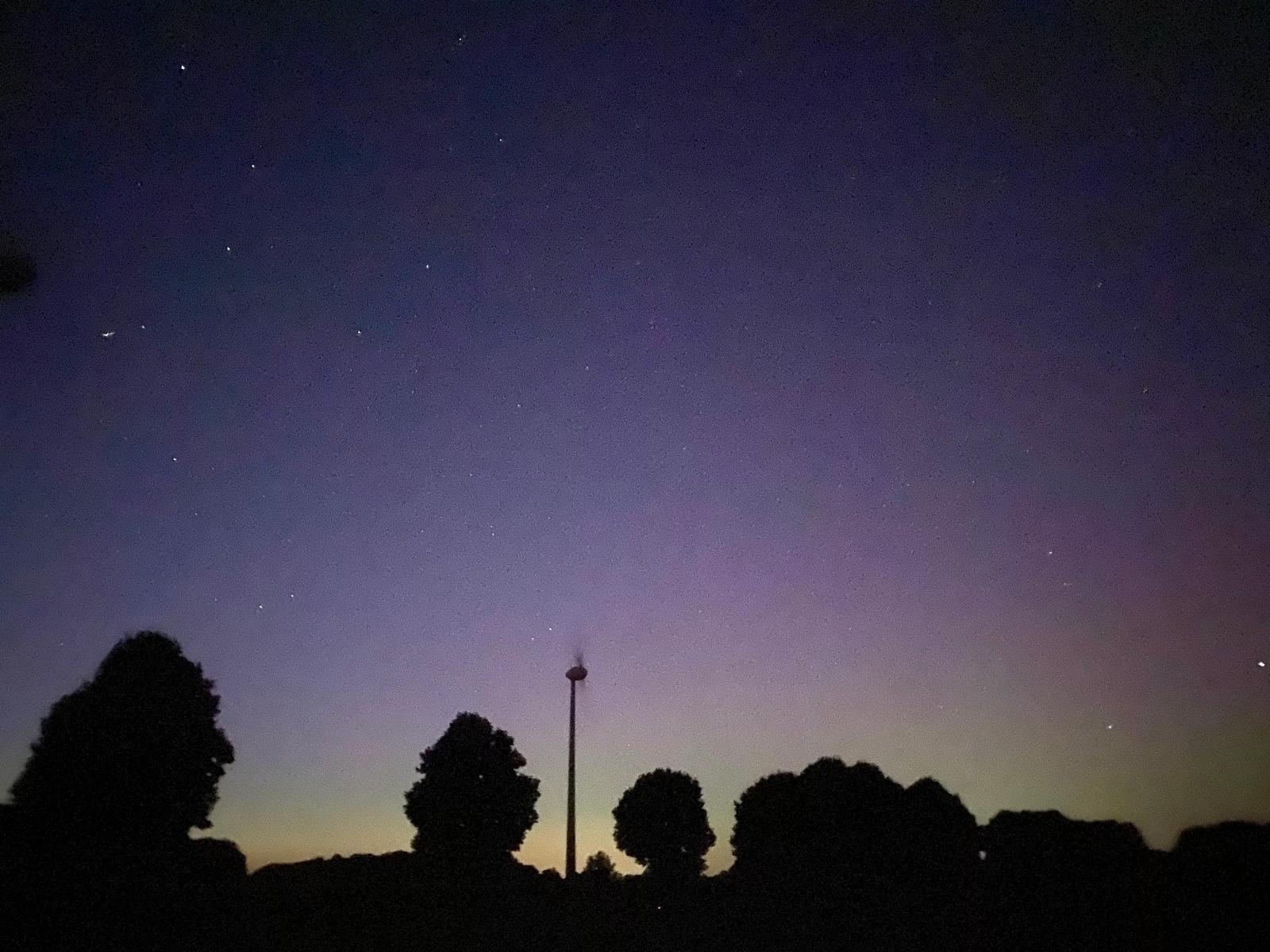 Das Polarlicht war hier in Kaltenkirchen (53.5°N) lange in Form weißlicher vertikaler Streifen mit etwas hellerem Leuchten am Boden erkennbar. (Die rote Farbe war wenn dann nur mit Fantasie und nur im Maximum zu erkennen.)