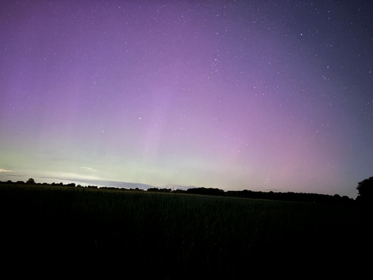 Bei Gallin in MV vorhin deutlich visuelles Polarlicht. Aktuell immer noch schwach visuell. Grüner Bogen vorhin 10° über Horizont. Strahlen bis fast zum Polarstern. Dazu noch ein SAR-Bogen, der durch den Zenit geht.