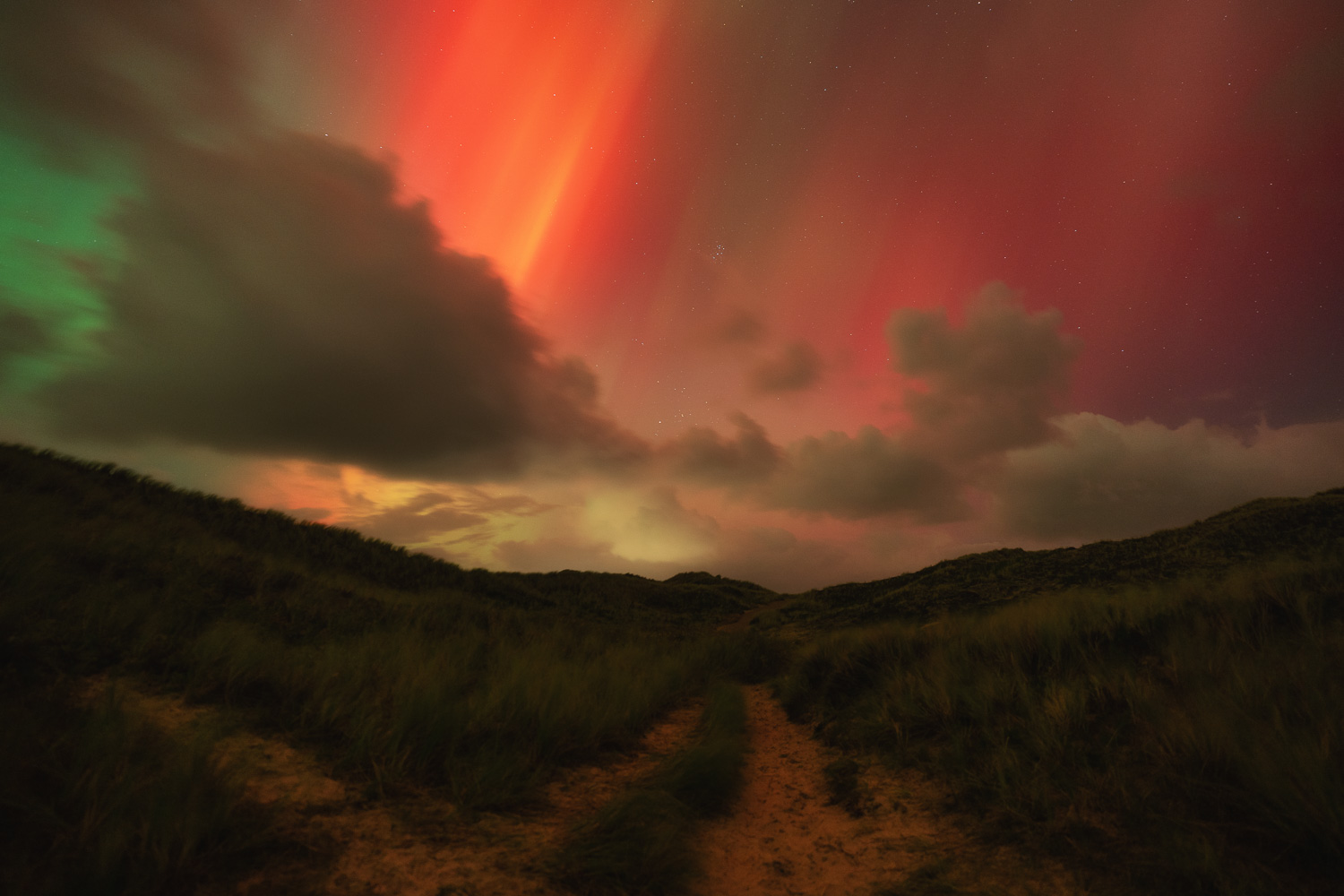 Anfangs nicht viele Strukturen. Alles eher flächig Grün und Rot. Gegen 22.30 Uhr deutlich visuelle helle Beamer. Fotografisch selbst im Zenit der Himmel in rot getaucht. Ab 24 Uhr begann die Wolkendecke zuzuziehen.