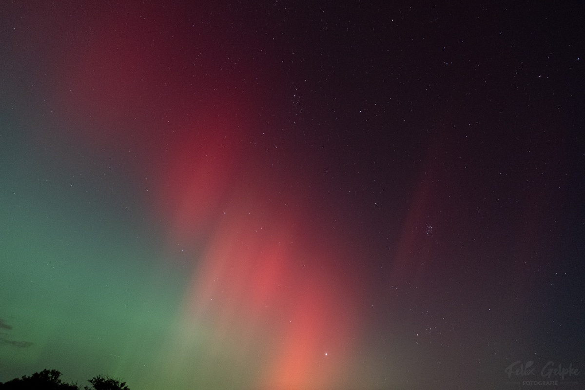 Beobachtungsbericht: Ich habe mir diesmal einen etwas dunkleren Standort gesucht, der auch mehr freien Blick Richtung Osten hat. Das war im Nachhinein die beste Entscheidung. In der Dämmerung war erstmal noch nichts zu sehen, es zogen einzelne Wolken durch. Ab etwa 19:40 MESZ schaute der grüne Bogen über einer Wolkenbank im Norden heraus. Langsam gesellten sich violette Schimmer dazu. Alles nur fotografisch sichtbar. Gegen 20:00 MESZ gab ein kurze Aktivitätsphase mit einigen Beamern, diese kündigten einen ersten Substurm ab. Pünktlich dazu zog es fast komplett zu. In den Wolkenlücken war aber rot und Violett auf den Fotos zu erkennen. Ab 20:40 MESZ klarte es dann wieder auf. Der grüne Wahnsinn beginnt, ab jetzt war es auch schwach visuell zu erkennen. Begleitet wurde der grüne Wahnsinn durch einige rote Beamer. Um 21:00 MESZ wurde es dann erstmal wieder ruhig für etwa 30 Minuten. Dann gewann der grüne Bogen deutlich an Helligkeit und stieg in die Höhe. Großes Feuerwerk mit visuell deutlich sichtbaren Beamern ab 22:20 MESZ. Bis 23: 00 MESZ erfasste das Polarlicht den gesamten nördlichen Himmel von Ost über Nord bis West. War im Osten aber viel heller. Rote Beamer hell bis sehr hell visuell zu erkennen, auch die Bewegung war erkennbar. Das grüne Polarlicht war ebenfalls visuell hell erkennbar, blieb aber eher gräulich. Um die Zeitherum war auch der SAR-Bogen fotografisch nachzuweisen. Danach flaute die Aktivität wieder ab, fotografisch tanzten im Osten rote und grüne Polarlichter aber lange Zeit umher. Die Helligkeitswechsel des grünen Polarlichts waren schnell. Um 23:45 zog der Himmel dann leider sehr zügig zu, so dass ich den nächsten Substurm um 1:00 MESZ nicht beobachten konnte.
