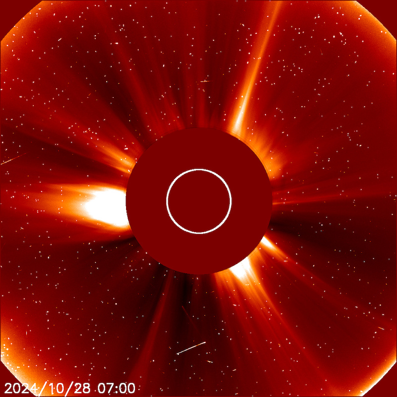 Der Komet hat das C3-Blickfeld mit einer Helligkeit von etwa +7 mag betreten. So sieht der kleine Kerl aus (unten rechts). Er könnte +3 bis +2 mag hell werden. Unabhängig von der Tatsache, ob der gesamte Kern inzwischen zerbrochen ist oder nicht: nahezu der gesamte Staub befindet sich noch nahebei, so dass diese Staubwolke im vorwärts streuenden Licht evtl. heller erscheint, als es ein intakter Kometenkern mit Schweif würde. Die nächsten Stunden werden es zeigen. Zum Vergleich: Spica (Alpha Vir) ist am 24.10. gegen Mittag aus dem Gesichtsfeld von C3 ausgetreten (am rechten Rand; LASCO C3-Bilder entsprechend herunterscrollen), Spica ist +1.0 mag hell.