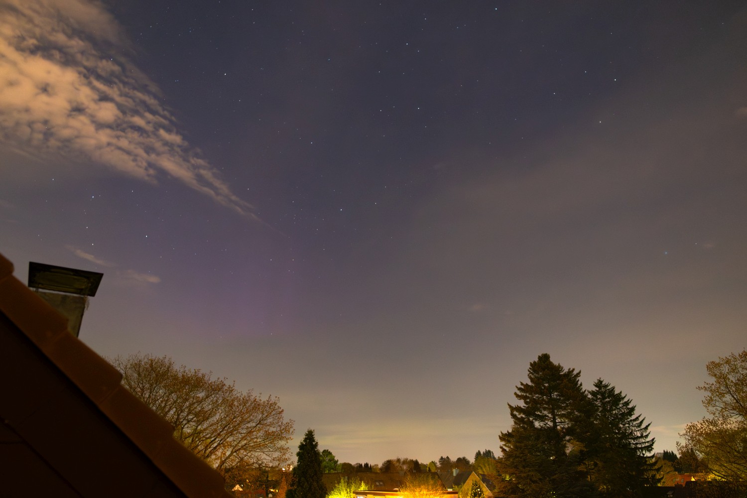 Das rötliche Leuchten ganz rechts auf dem ersten Bild ist sicherlich kein PL sondern Lichtverschmutzung, aber das diffuse lila dürfte sicherlich PL sein, denn es ist genau in den Bereichen zu sehen, wo man auch Sterne erkennen kann. Sicherlich gibt es schönere Polarlichter, aber immerhin hattest Du Glück, hier war es bis jetzt den ganzen Abend dicht bewölkt. Es erinnert mich sehr an meine Bilder von gestern. Zur besseren Beurteilung müsste man mal bei einer ähnlichen Wettersituation ohne entsprechend gute PL-Werte dort auch Fotos machen, wenn dann das "lila" dann auch da ist, ist es natürlich kein PL, aber heute Abend scheint es zu passen, auch was ich so von anderen Orten sehen kann.