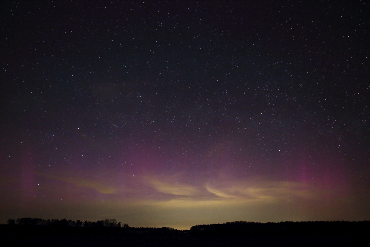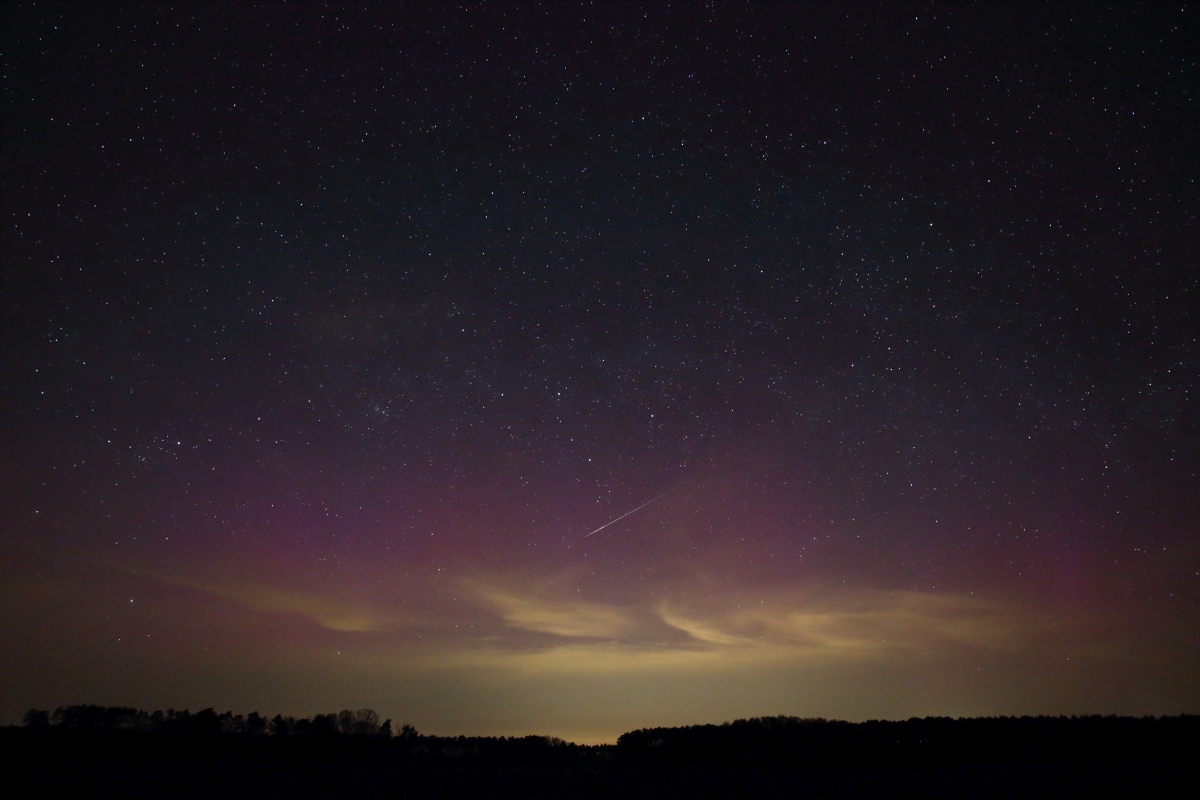 Ich muss meine fast 600 Aufnahmen des an meinem Standort deutlich visuell in Erscheinung tretenden Polarlichts auch erstmal genauer sichten. Da waren doch einige Boni wie der Flare an einem "blauen" Starlink-Satelliten (23:18:00 MESZ) oder eine unscheinbare Lyride (00:06:46 MESZ) mit dabei. Die immer wieder durchziehende tief hängende Bewölkung trübte die Freude ein wenig, legte sie doch vor allem auch die Lichtverschmutzung im Norden gnadenlos offen. Das ist auch der einzige wirklich negativ auffallende Bereich, wo man je nach Bewölkung belichtungstechnisch deutliche Einbußen in Kauf nehmen muss, in dem vom Herzberger Teleskoptreffen bekannten Jeßnigk im Südwesten Brandenburgs, wo es mich nach einem halben Jahr Abstinenz mal wieder hinzog. Zumeist bin ich dort ganz ohne Kamera und Stativ unterwegs, da fußläufig immer reichlich Kilometer zustandekommen, die ohne viel Gepäck leichter abzuspulen sind. An einem dunklen Sternenhimmel gibt es dort, gute Transparenz natürlich vorausgesetzt, für einen Großstädter aber auch mit bloßem Auge sehr viel zu entdecken.