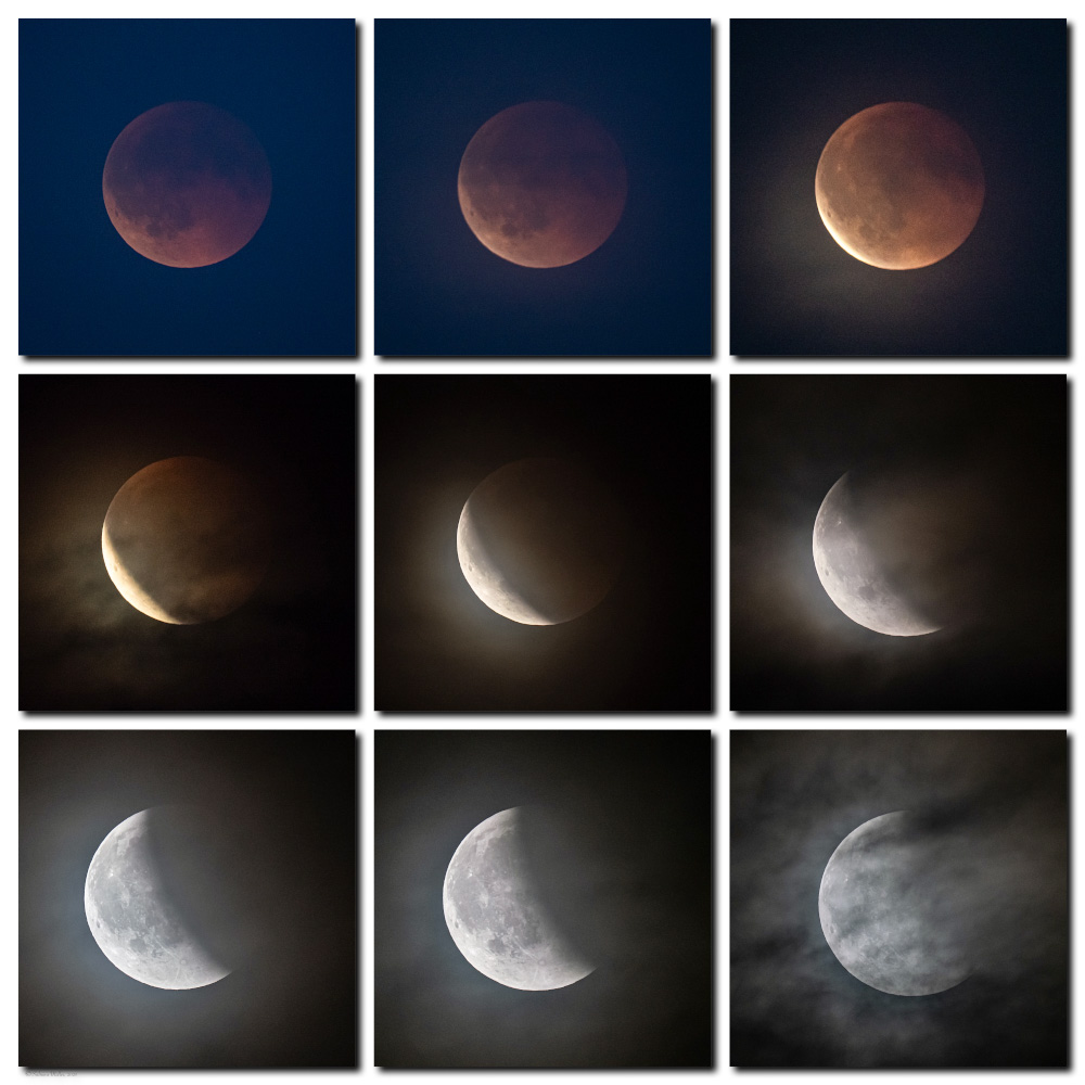Auch hier im südhessischen Schaafheim gab es reichlich Schleiergewölk, das den Mond erst knapp vor Ende der Totalität sichtbar werden ließ. Auch in der partiellen Phase war das Fokussieren der Kamera (EOS 6D mit 4-5.6/100-400mm L Linse) eine ständige, schwierig zu beherrschende Herausforderung. Erst kurz vor Ende der partiellen Phase gab es dann mal "richtige" Wolkenlücken. Egal, schön war es trotzdem.