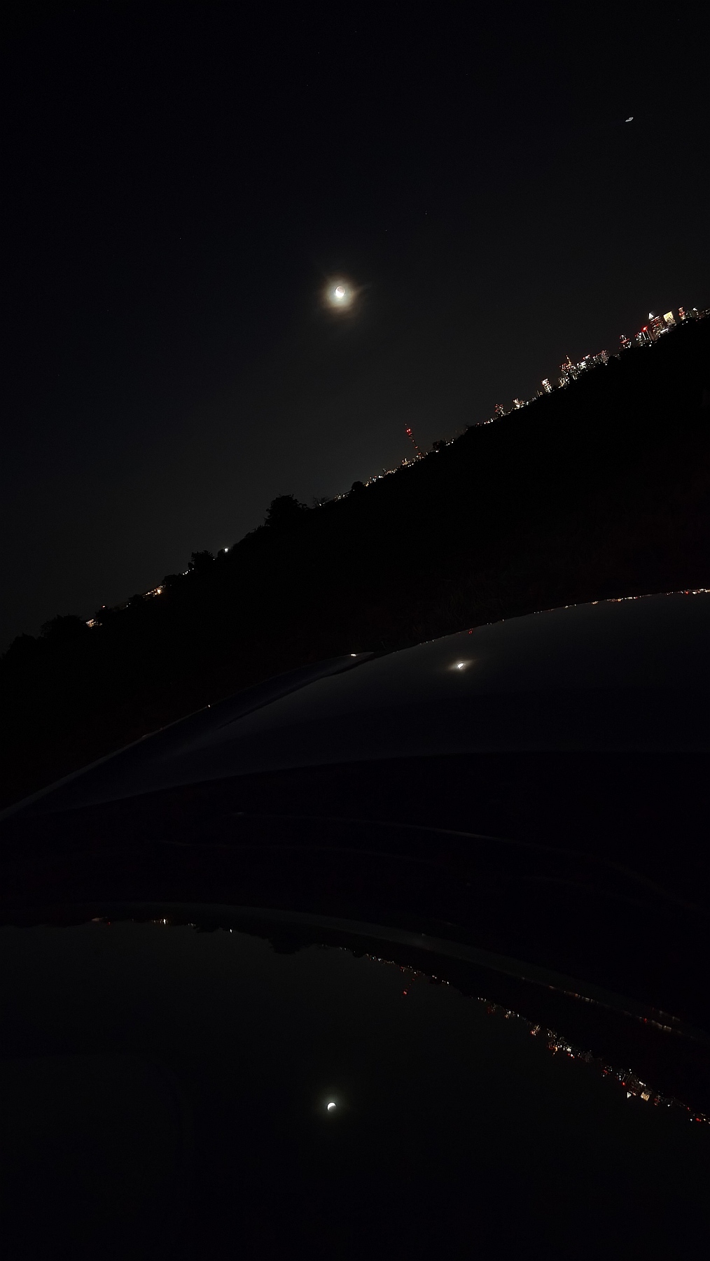 Das zweite Foto mit doppelter Spiegelung von Mond und Skyline an unserem Auto hat meine Gattin mit ihrem Smartphone um 21:11 MESZ..aufgenommen.