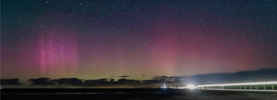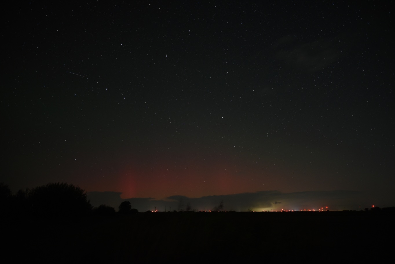 Eigentlich war ich an diesem Abend nur für Milchstraßenfotos draußen, das Wetter war ja perfekt und die Luft sehr klar. Positioniert hatte ich mich auf einem Feldweg bei Rethwisch südöstlich von Bad Oldesloe. Während der Beobachtung fiel mir teils kräftiger grüner Airglow nach Norden auf, sodass ich eine Serienaufnahme startete. Gegen 22:30 MESZ hatte ich plötzlich etwas rötliches Glimmen drauf, was sich später dann auch auf der Webcam in Kap Arkona zeigte. Einmal ein Bild vom rötlichen Glimmen in Horizontnähe: