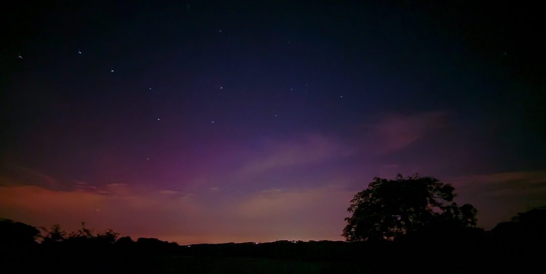 Hallo! Seit einiger Zeit in Curau bei Lübeck schwach visuelles Polarlicht in Wolkenlücken. Fotografisch rot-violette Strahlenbündel.