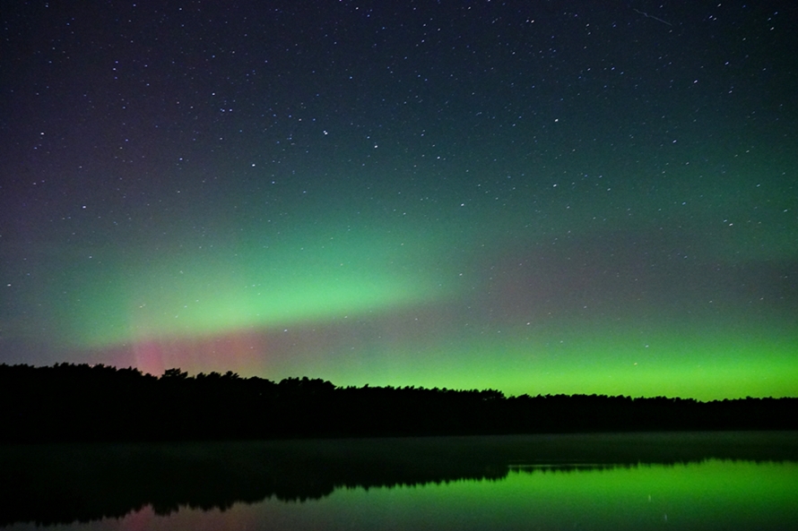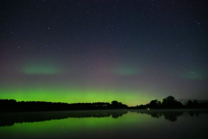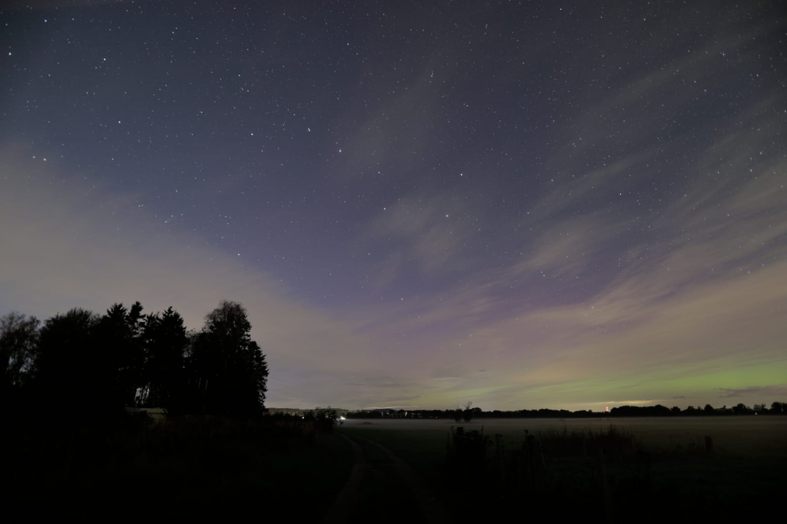 Großartig war es gestern Abend und viel mehr als ich erwartet hab! Weil auf der Webcam vom Peilturm Kap Arkona der grüne Bogen schon so hoch war, als ich geguckt habe, bin ich runter zur Badestelle am See gegangen. Und da hat sich die Zeit in der Kälte wirklich gelohnt, denn das PL war bereits zu dem Zeitpunkt visuell sichtbar und wurde noch deutlich heller. Und auch Farben waren deutlich sichtbar. Als alles tropfnass und das Polarlicht deutlich schwächer geworden war, bin ich nach Hause gegangen. Vom zweiten Substorm habe ich dann gerade noch so etwas vom Fenster aus mitbekommen. Weil inzwischen die vom See aufsteigenden Nebelschwaden immer höher kamen und auch Wolken aufzogen, habe ich die Beobachtung gegen Mitternacht abgebrochen.