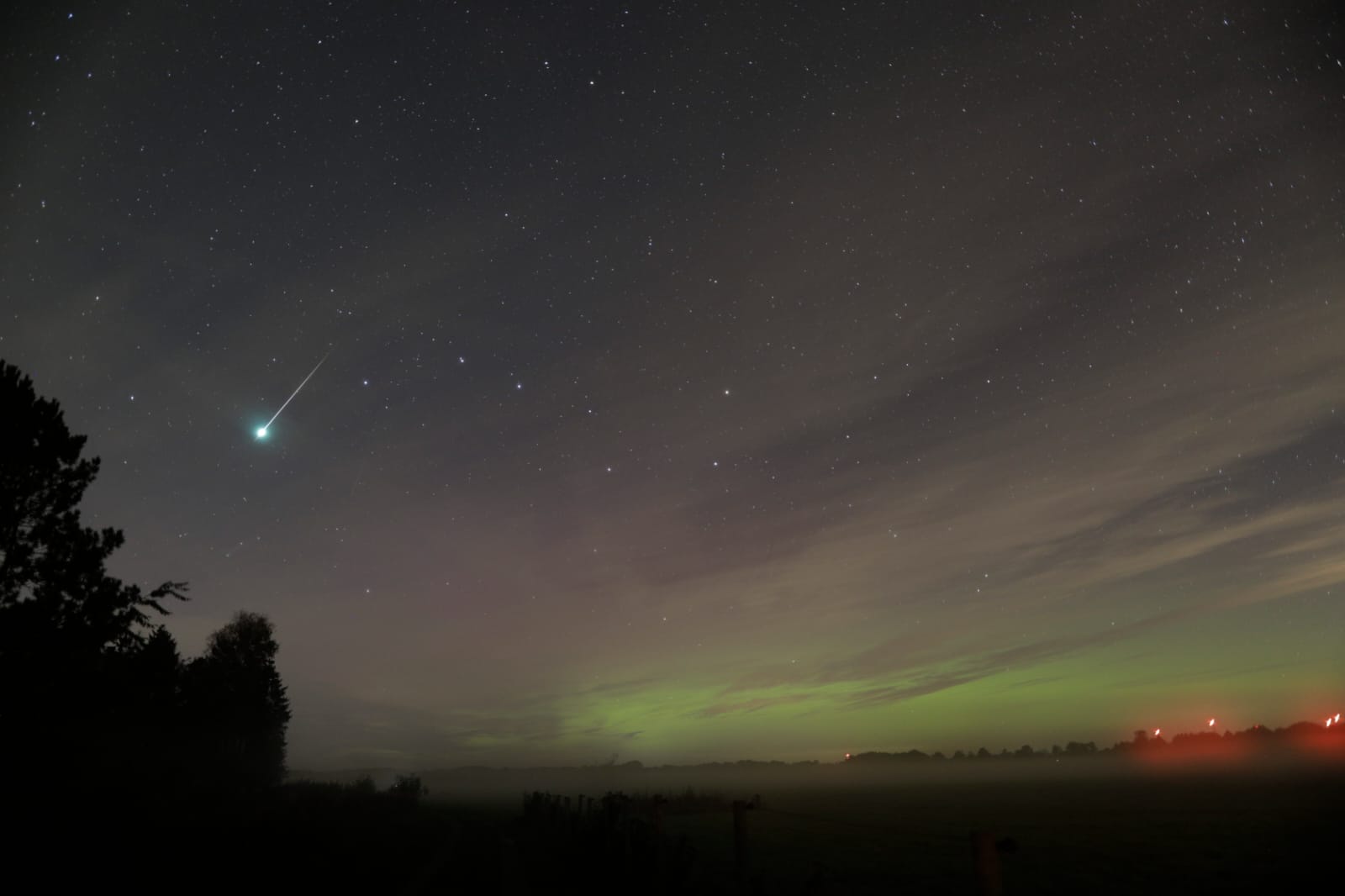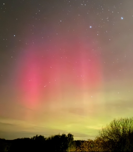 Bei Eilsdorf in Schleswig-Holstein ist aktuell der grüne Bogen deutlich visuell zu erkennen. Ab und zu auch Strahlen. Auch Protonenaurora (grüne Flecken) waren zeitweise visuell sichtbar. Fotografisch ist noch rot und violett über dem Bogen.