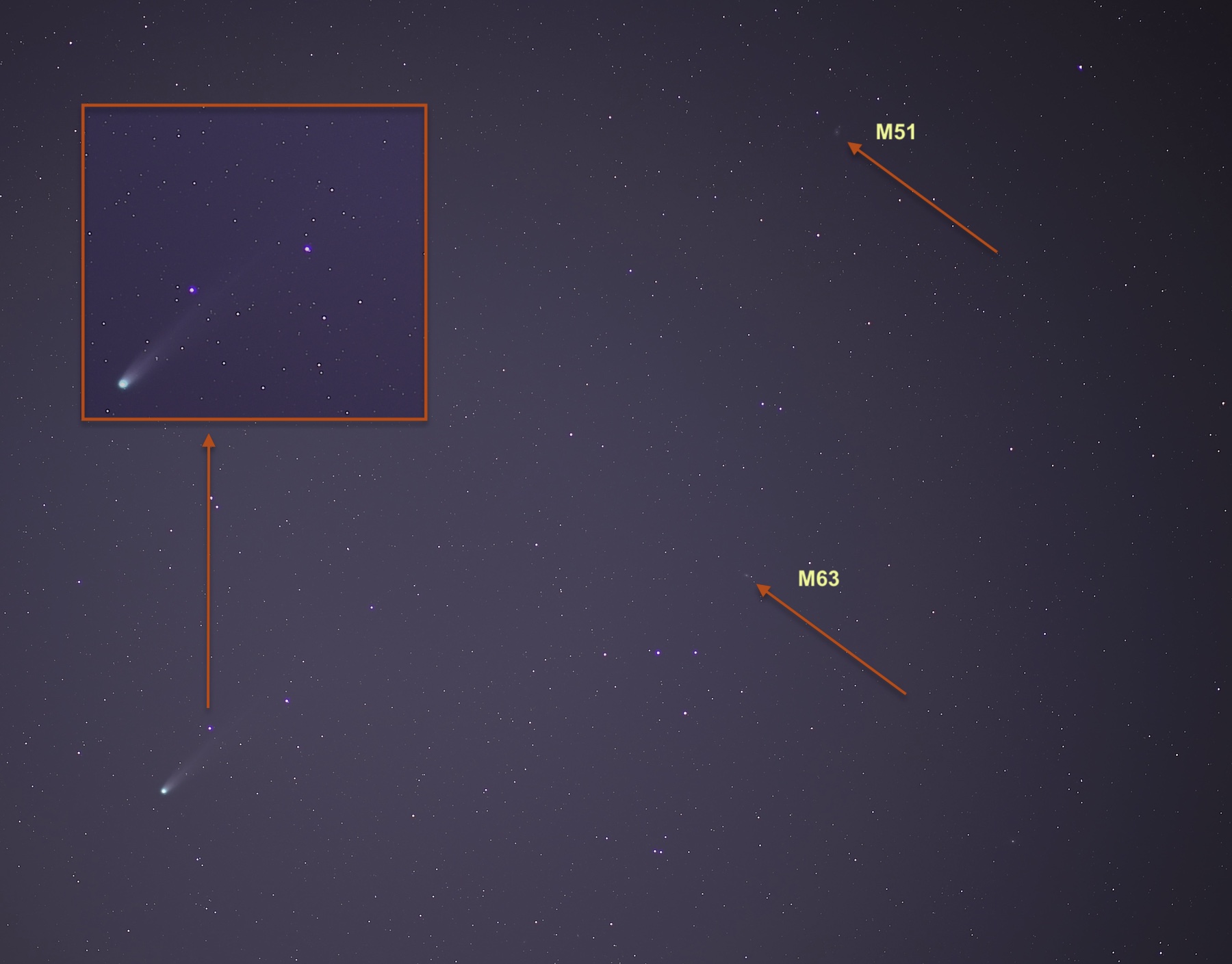 Mir ist es lediglich gelungen eine einzelne 45 s Aufnahme vom Kometen zu erstellen. Mein Plan waren eigentlich 80 Einzelaufnahmen, um eine gestackte Aufnahme anfertigen zu können.