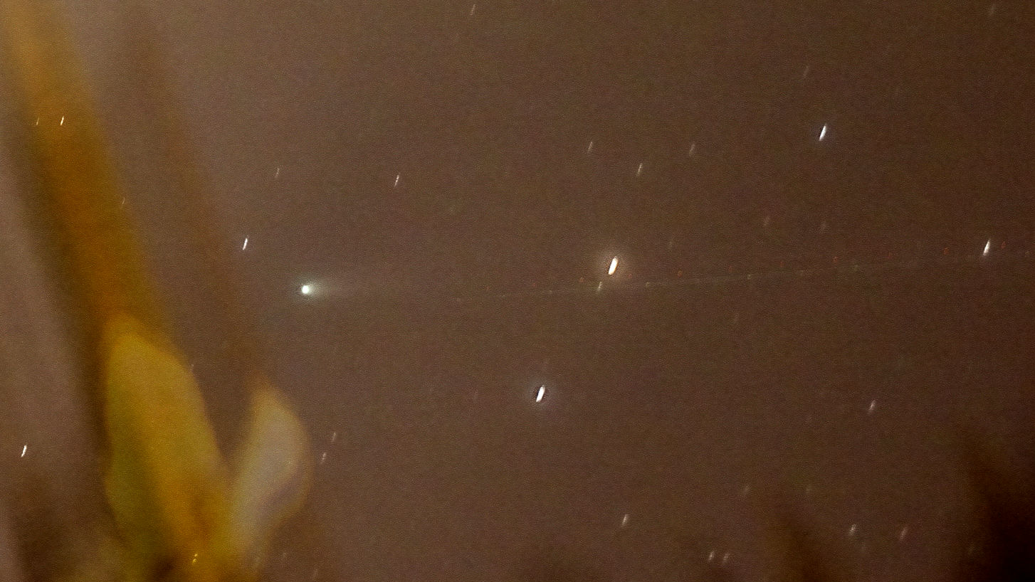 ich habe auf gut Glück mal meine Cannon 1000d in die Richtung aufgestellt, wo ich den Kometen vermutete, hätte fast nicht daran geglaubt, ihn zu erwischen, bei den grottenschlechten Verhältnissen zwischen halogenbeleuchteten Büschen so tief am Horizont, der bei mir eine einzige Lichtseuche ist. Doch dieses Foto beweist, dass er fotografisch unter widrigsten Verhältnissen doch zu erwischen ist! Mit bloßem Auge wäre da aber niemals was möglich.