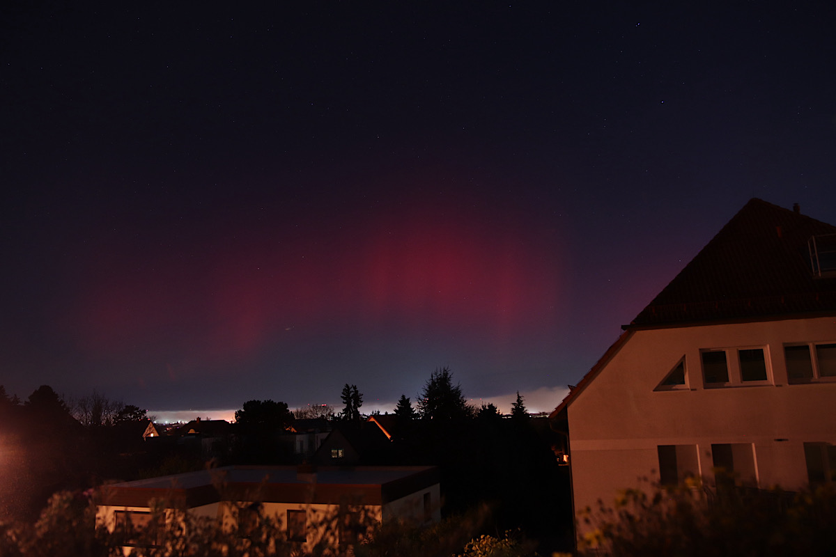 soeben konnte ich zwischen 2:45 Uhr und bis etwa 3:30 Uhr visuell rote Polarlichter direkt in Dresden beobachten. Rote Beamer mit einem breiten Display war gut zu sehen trotz Lichtverschmutzung. Höhe erreichte anfangs 20 Grad bis ca. 30 Grad in der aktivsten Phase