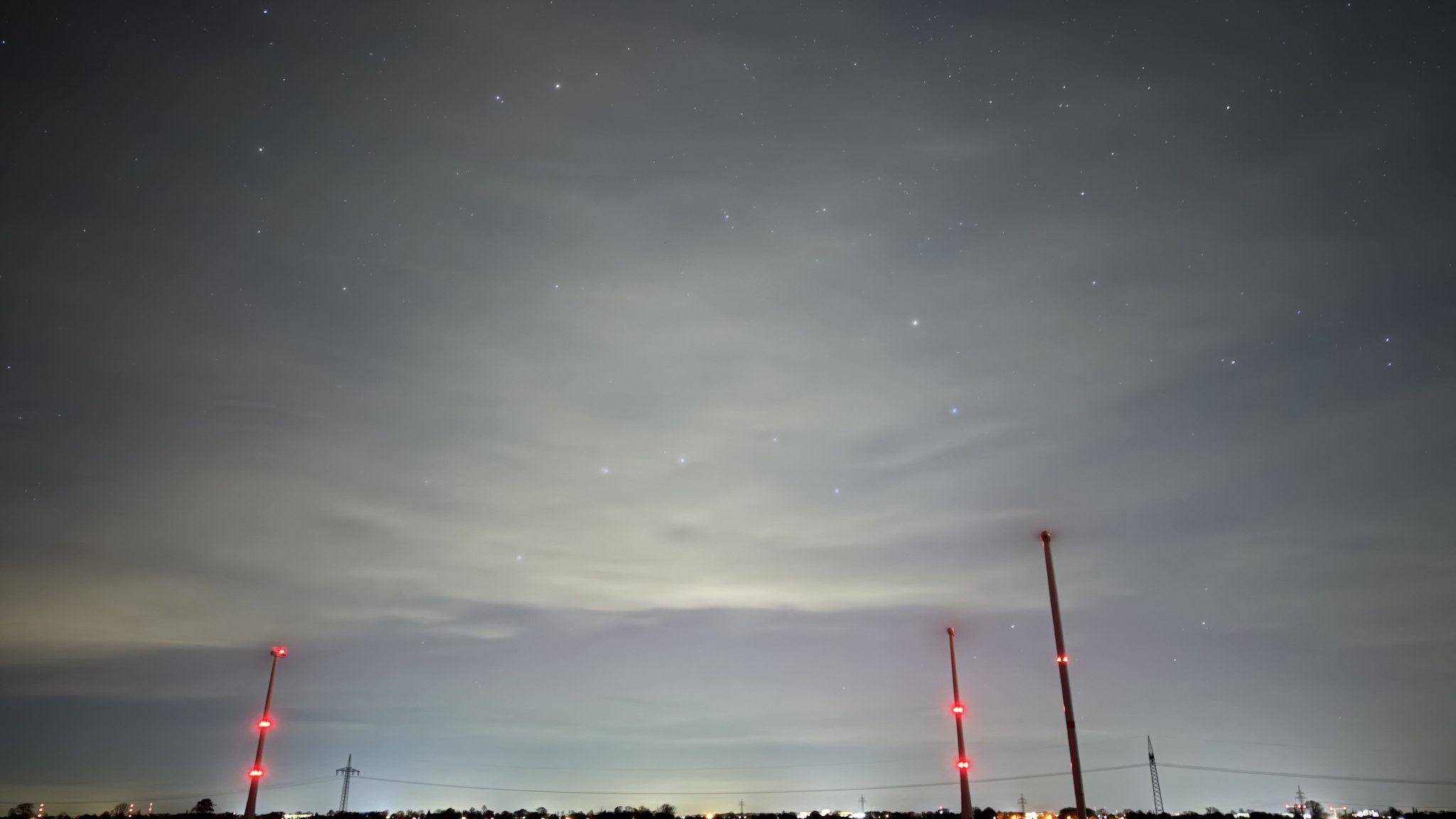 In der Nähe von Bremen war gegen 21:39 Uhr leicht rot-grünes Polarlicht sichtbar, allerdings nur fotografisch. Die Wolken haben die Sicht massiv eingeschränkt, entsprechend suppig ist auch das PL. Aber irgendwie besser als nix.