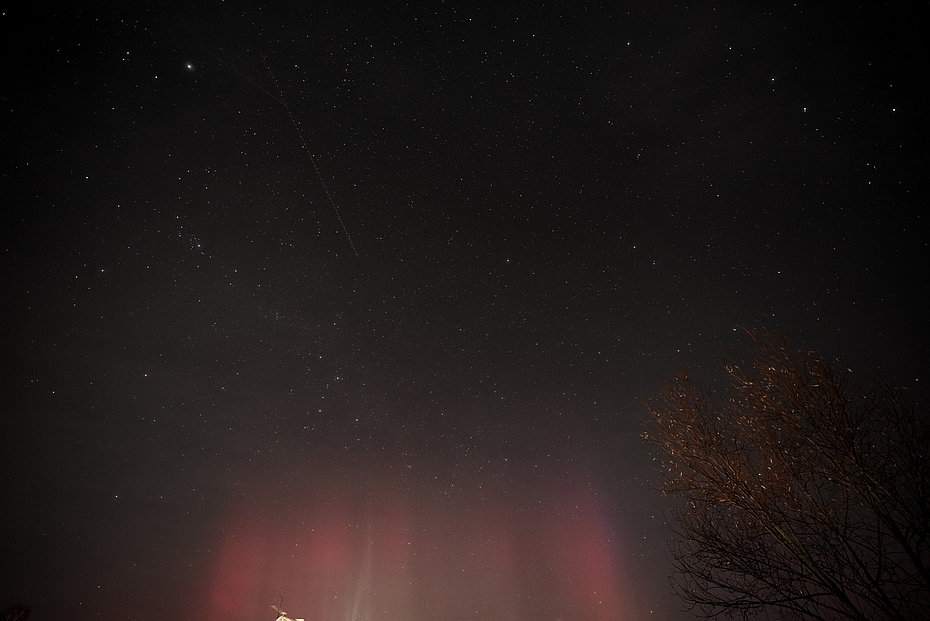 Am Abend war kein Polarlicht mit freiem Auge vom Kreuzberg/Niederösterreich zu sehen. Die Kamera hielt zwischen 17:52 und 17:55 MEZ aber einen roten SAR Bogen fest ("stable auroral red", siehe https://www.meteoros.de/themen/polarlic ... polarlicht ). Mit Weitwinkelobjektiv f=24mm war der SAR Bogen nicht auf ein Bild zu bekommen, ich muß auf ein weitwinkeligeres Objektiv sparen.