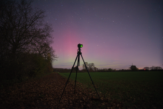 Nun ja. Auf der Aufnahme ist außer vielen Artefakten kaum was Brauchbares zu erkennen. Die vorhandenen Sterne kann ich in Stellarium leider nicht zuordnen. Die GoPros können das fest montiert mit den richtigen Einstellungen mittlerweile qualitativ eigentlich viel besser, siehe zum Beispiel die Aufnahmen der IAP-Webcams. Polarlicht ist es aber definitiv nicht. Auf meinen eigenen, anderen Aufnahmen oder denen von Webcams war zu diesem Zeitpunkt keine entsprechende Aktivität nachweisbar. Du hast leider so viel Lichtverschmutzung um dich herum ( https://www.lightpollutionmap.info/#zoo ... oiODUifQ== ), dass eine künstliche Lichtquelle als Verursacher im wahrsten Sinne des Wortes naheliegend ist...