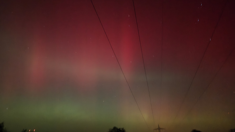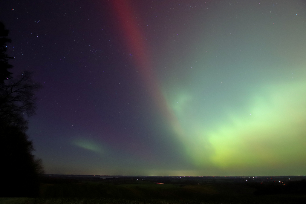 Erst fotografisch, kleinräumige rote Beamer, ab etwa 21:20 Uhr visuell, ab 21:40 Uhr hell und ausgebreitet über den Nordhorizont.