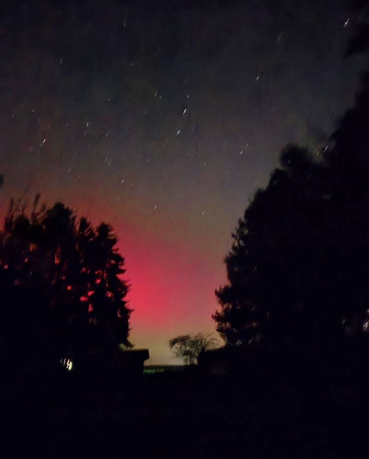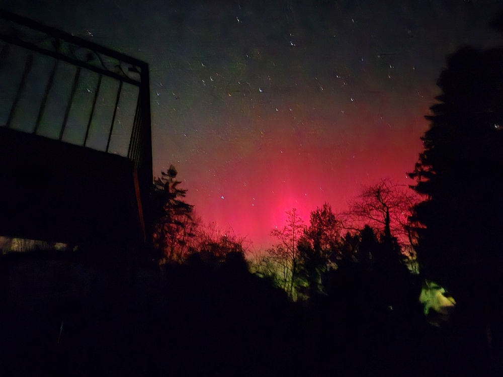 Auch aus Büdelsdorf kann ich ein Polarlicht-Spektakel melden: Alles dabei, vom Grünen Bogen bis rotem Pulsieren, Beamer, Ragda und SAR-Bogen, das ganze deutlich über den Zenit hinaus bis in den Südhimmel.