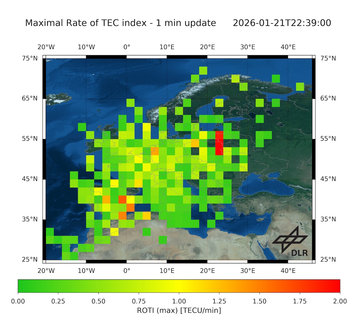 Nur ROTI zeigt hier und da rote Punkte auf einer Linie bei 55°N, was verdächtig ist - vielleicht ist das die Proton-Aktivität
