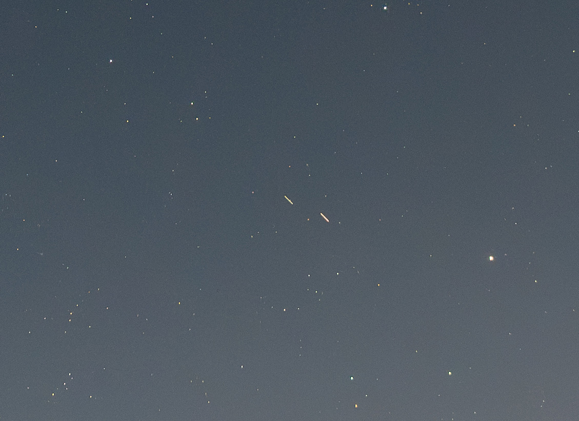 Plötzlich entdeckte ich zwei helle Punkte (etwa 0 bis 1 mag) am Himmel. Sie waren ungefähr eine Minute lang sichtbar, bevor sie in den Erdschatten eintraten. Das muss definitiv Artemis II gewesen sein. Die Flugrichtig, die Helligkeit, die Geschwindigkeit passten. Außerdem waren die Stufen schon getrennt.