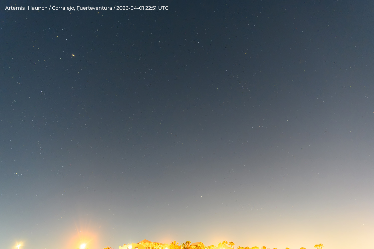 Ich sah Artemis II etwa 15 Minuten nach dem Start über Fuerteventura fliegen. Ich hatte erst gar nicht daran gedacht, dass die Rakete sichtbar sein könnte. Aber Bastian Werner hat mich gefragt, ob ich sie heute beobachte. Also bin ich gut Glück raus! Danke Bastan!