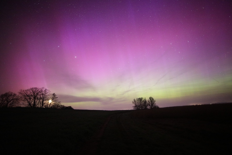 Nachträglich ein Video vom 23/24. April von meiner Allsky-Kamera in Idstein / Südwesthessen (50,22° N). Es war stark bewölkt, aber zeitweise kann man durch die Wolkenlücken sehen, dass der gesamte Himmel violett gefärbt war, bis ca. 20-30° über dem Südhorizont (Süden ist oben im Video):