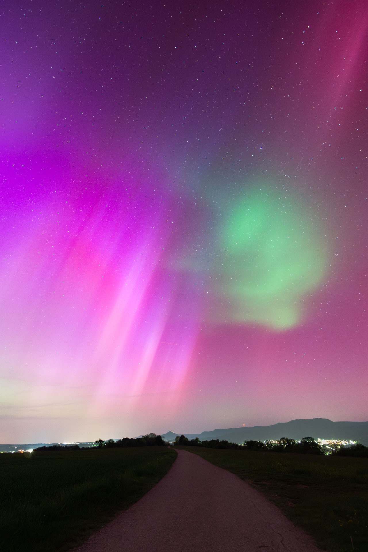 Hallo, ich bin noch immer beeindruckt, von dem Himmelspektakel das sich mir am 10.05.2024 bei uns in Geisenfeld, Lkr. Pfaffenhofen (Bayern) bot. Mein erstes Polarlicht überhaupt, in meiner Heimat und dann gleich sooo spektakulär!!! Bereits ab 22.04 Uhr konnte man erste pinkfarbene Schleier fotografisch festhalten. Ab 22.16 Uhr war das grandiose Schauspiel auch mit dem bloßen Auge zu verfolgen. Ab 23 Uhr war es auch direkt im Ort visuell sichtbar.