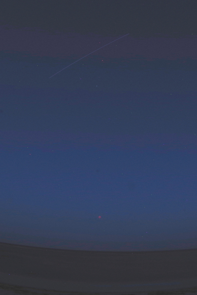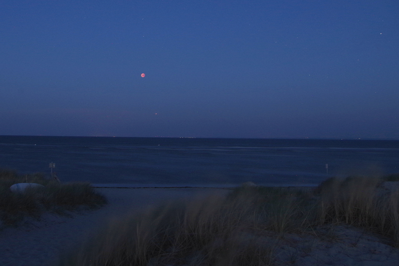 Eine Wolkenbank über Mecklenburg hat dem Mond dann als gutes Versteck gedient. Erst gegen 22:11 Uhr konnte er sich gegen Dunst und Helligkeit behaupten. Den ISS-Überflug gegen 22:35 habe ich fast verpasst, da ich noch mit den richtigen Einstellungen gekämpft habe. Entsprechend ist das Bild gelungen. Gegen 22:43 Uhr ist dann auch der Mars aus seinem Wolkenbett aufgestanden. Zusammen habe sie dann ein schönes Bild abgegeben. Meine Bilder vom Schattenaustritt erspare ich euch, da hat Tobias über mir schon viel bessere eingestellt. Nur dies eine von Mitternacht: Nachdem der 1. ISS-Überflug nicht so toll war, habe ich noch bis zum 2. ausgeharrt (der Strand war inzwischen deutlich leerer geworden). Hat sich gelohnt, auch wenn der Mond schon wieder ordentlich aufgeblendet hat. Ein toller Abend am Strand!
